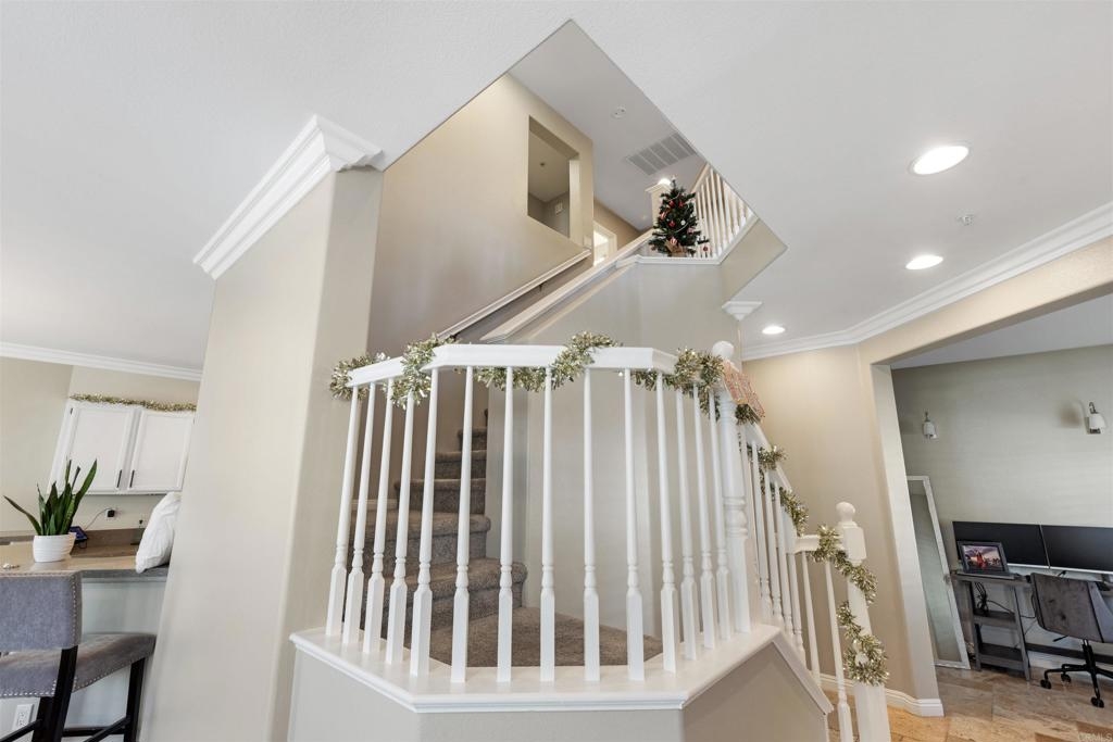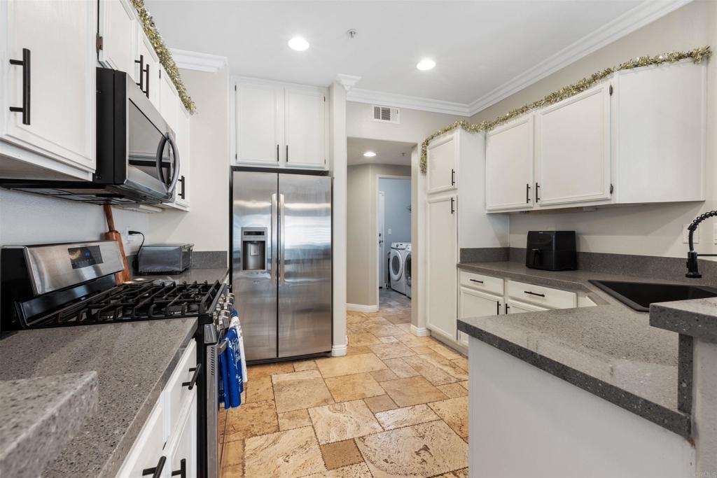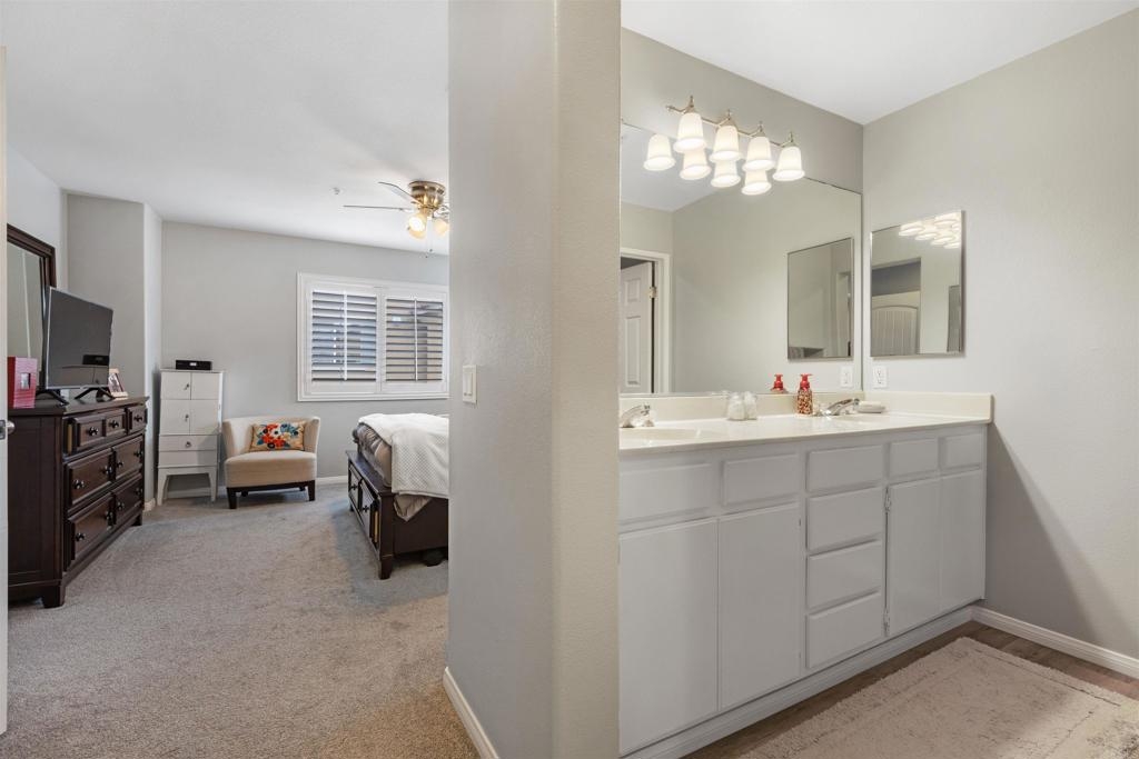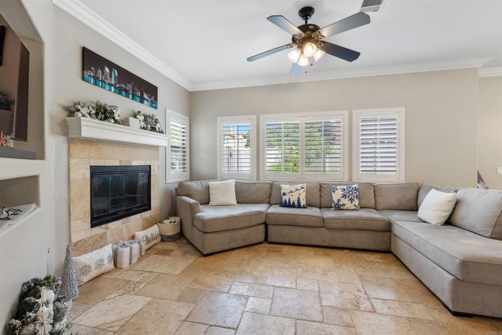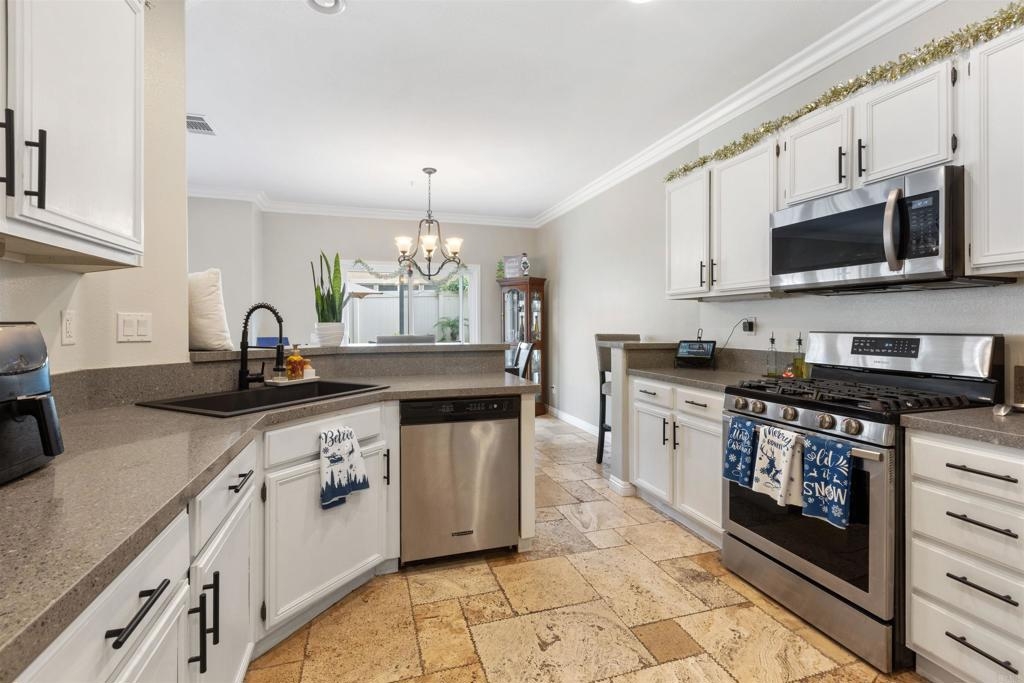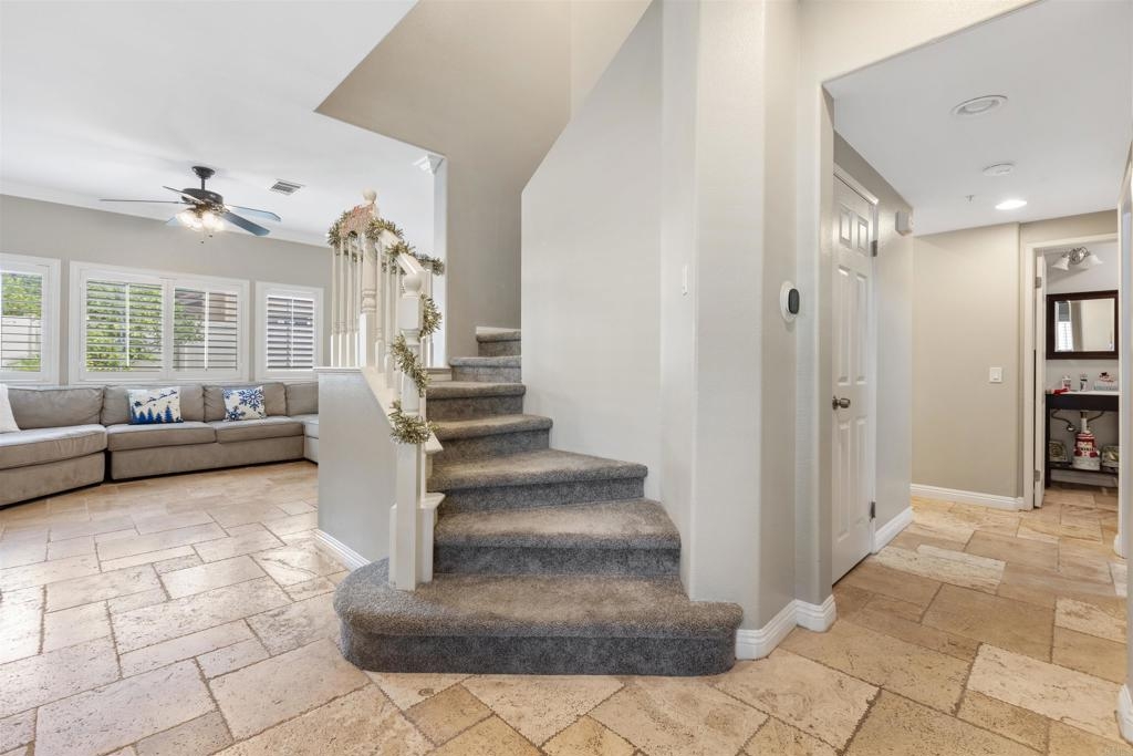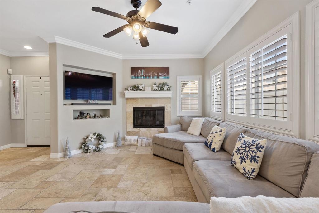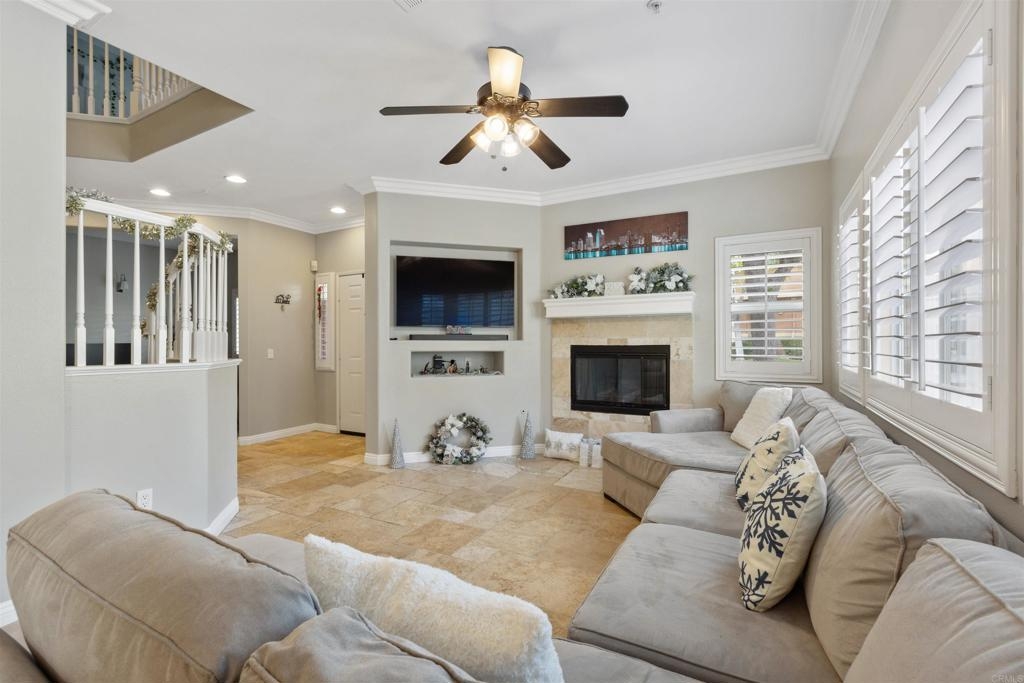 Welcome to your dream townhouse in the desirable Auberry Place gated community, where luxury meets comfort! This stunning two-story residence boasts 3 bedrooms, 2.5 bathrooms, a two-car garage, and a wealth of upgrades that redefine modern living. As you step inside, you are greeted by a spacious living room and dining area, adorned with crown molding and featuring 9-foot ceilings that create an atmosphere of elegance and openness. All upgrades were done 3 years ago. The recently renovated kitchen is a chef's delight, showcasing newer stainless steel appliances, pristine quartz countertops, and a stylish new sink. The heart of this home is not only functional but also a visual feast. Entertaining is a joy with the glass sliding door leading to the backyard oasis. This corner unit boasts a generous backyard with lush turf, carefully designed hardscape, and a flourishing lemon tree laden with citrus treasures. Picture yourself enjoying al fresco meals or simply basking in the California sunshine in this private retreat. The list of upgrades goes on, with fresh French grey paint adorning the entire residence, new plush carpeting underfoot, and brand-new interior doors adding a touch of sophistication. The thoughtful inclusion of plantation shutters provides both privacy and style, while the newly installed fan in the master bedroom ensures comfort year-round. This townhouse is not just a home; it's a masterpiece. From the built-in entertainment center for your TV to the timeless travertine floors, every detail has been carefully curated to enhance your living experience. New outlets, switches, and USB outlets further exemplify the commitment to modern convenience. Additional features include a newer Rheem water heater for efficiency and peace of mind. With access to the community pool within the secure Auberry Place gated community, you can enjoy resort-style amenities just steps from your front door. Seize the opportunity to make this townhouse your own – a place where luxury, comfort, and style converge in perfect harmony. Schedule a viewing today and experience the lifestyle awaiting you at Auberry Place. Your dream home is now a reality!