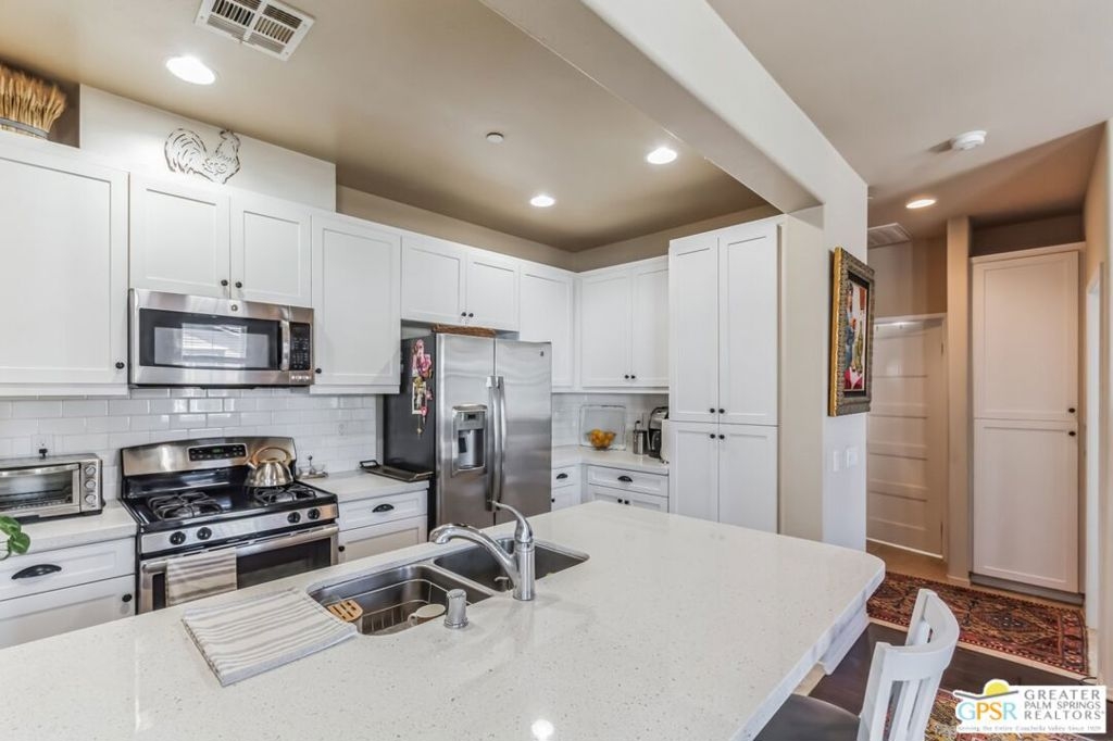 Stunning Temecula Townhome! Experience the charm of this beautiful Temecula townhome featuring a bright and open floor plan with 2 bedrooms and 2 bathrooms. Enjoy the serene views from the wraparound balcony. The home boasts central AC and heating, beautiful flooring, recessed lighting, and ample storage space. The modern kitchen includes Silestone countertops, stainless steel appliances, and white cabinets, with the refrigerator included. The unit features a mix of wood, tile, and carpet flooring. Both bedrooms are carpeted and offer large closets, with the primary bedroom including a private ensuite bathroom. The convenience of an indoor laundry area with a washer and dryer is a plus. Additional features include solar panels, a tankless water heater, and a fire sprinkler system. The property comes with a 2-car tandem garage. Located close to the duck pond, park, and plaza, and just minutes away from Temecula Old Town, vineyards, and Pechanga, this townhome is in an amazing location.