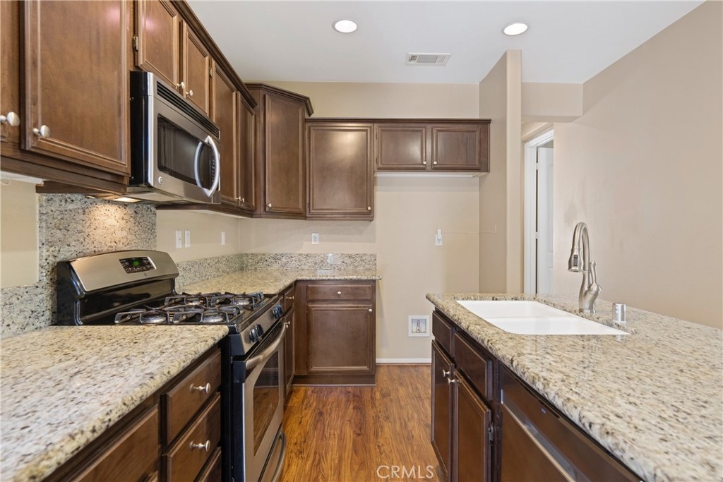 Through this floorplan's iconic front porch, enter to the expansive front living space. Most notable in this sought-after model is the main floor owner's suite, replete with walk in closets and separate shower and tub bathroom. The kitchen area is bathed in natural light and showcases slab granite counters and engineered wood flooring. Upstairs, a sprawling family room with gas fireplace invites multi-level gatherings on a grand scale. The secondary floor also houses a built in tech desk, ideal for operating a home business. The ancillary bedrooms and upstairs laundry facilities capture the essence of dual-zone living spaces and allows space in your togetherness for extended guests, growing children, multi-generational households to name just a few. The home's outdoor space features hardscaped surfaces, surrounded by block walls and alumawood fencing, ideal for minimal care maintenance. Located just steps to Wolf Creek's renowned Clubhouse and Pool, with state of the art fitness facility, BBQs, children's playgrounds and more, and situated within walking distance to the world-famous Pechanga Resort and Casino and award-winning Great Oak High School, it's your best bet to go all in on Domenoe Way!