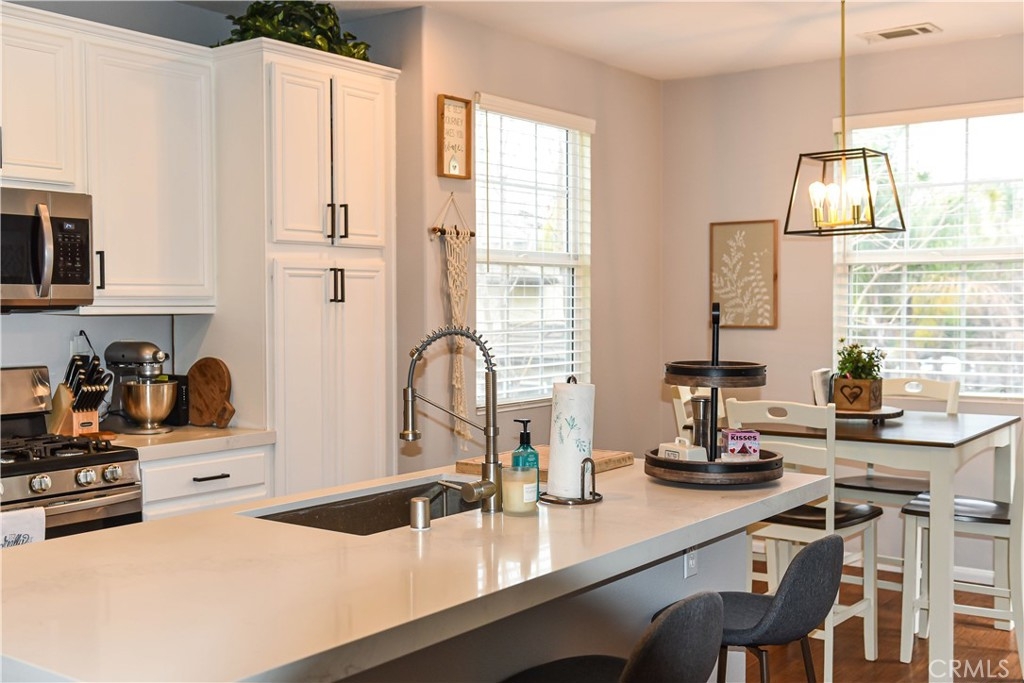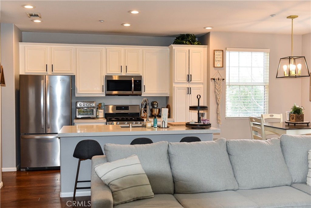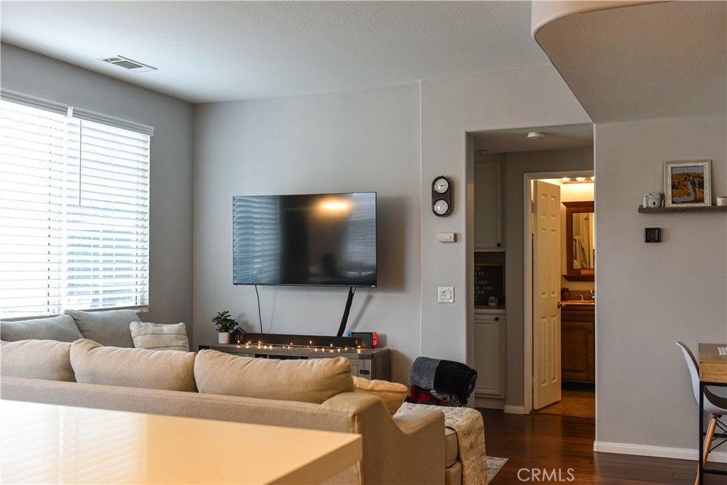 This beautiful, well maintained tri-level condo wont last long! Welcome to South Temecula's quaint and cozy condominium community. Upon entering the home you have easy access to an attached one car garage w/ample storage space. 2nd level features a charming living/family room boasting tons of natural light beaming in w/peek a boo views of the mountains and access to your relaxing patio lounge. Just off of the family room is the well coordinated kitchen & eat in dining room, very inviting w/bar height counters ideal for entertaining! The main floor offers recessed lighting & new hardwood floors throughout. Also on this level is a comfortable sized bedroom & personal bath w/shower, very versatile can be a guest room for family & friends or children's bedroom. The 3rd floor features your private master retreat w/bedroom & bath en-suite, bath shower combo, dual vanity and water room. Affordable HOA includes community pool/spa, clubhouse, walking trails, BBQ, picnic area & playground. Close to shopping, several golf courses, Highway 15, wine country, Pechanga Casino and Resort, Great Oak High School district.