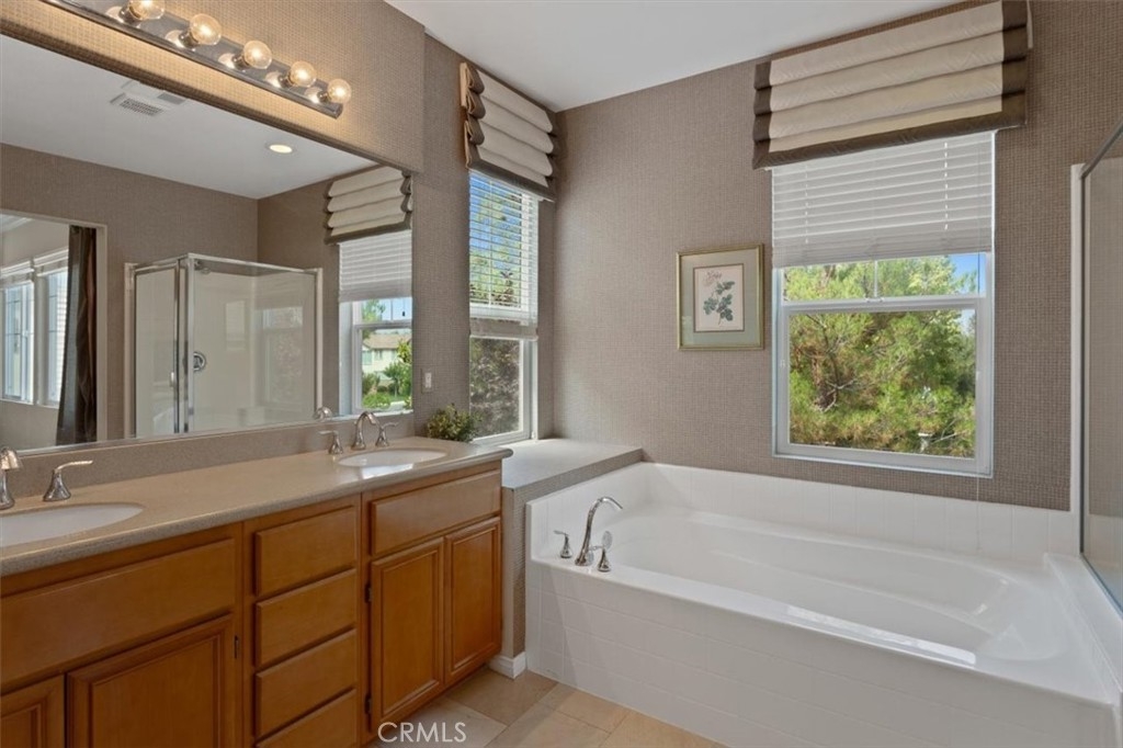 Welcome home to the Tamarack Collection of Wolf Creek! Step inside this TURN-KEY, former model home offering an open family room, breakfast nook, and kitchen layout. You’ll notice tile flooring throughout the main floor and windows allowing an abundance of natural light. The kitchen features a large eat-up bar, stainless steel appliances, and upgraded countertop and backsplash. The main floor powder room features a pedestal sink. Walk upstairs and you’ll find two spacious secondary bedrooms, bathroom, and laundry room with storage and a sink. The master bedroom offers a large walk-in closet, dual sinks, soaking tub, and walk-in shower. All of the bedrooms plus the family room have ceiling fans. Low maintenance backyard with no rear houses allows added privacy. Located near the private community pool! The desirable Wolf Creek community is close to shopping, restaurants, award winning schools, and offers convenient access to the 15 freeway. View our 3D walk-through video!