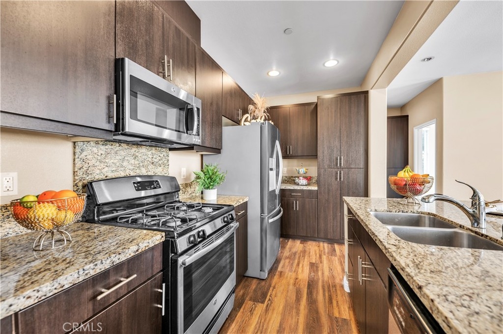 Welcome to BelVista Community — where comfort, style, and convenience come together. This beautifully remodeled and upgraded home is move-in ready, featuring new carpet, new laminate flooring, fresh paint, and updated fixtures throughout. The open-concept kitchen is designed for both everyday living and entertaining, offering granite countertops, stainless steel appliances (including refrigerator), double sink, soft-close drawers, and a convenient breakfast bar. Enjoy the ease of indoor laundry with washer and dryer included. The spacious primary suite provides a relaxing retreat, opening to a well-appointed primary bath with dual sinks, a large walk-in closet, and a step-in shower. A generous living room and additional sitting area create flexible space for relaxing or hosting guests. Step outside to the wrap-around balcony — perfect for morning coffee or evening unwinding. Additional highlights include a tandem 2-car garage with extra storage and brand-new epoxy floors, plus PAID FOR TESLA SOLAR and a tankless water heater for added efficiency. Residents of BelVista enjoy HOA amenities including a pool, spa, children’s playground, and BBQ area. Conveniently located near shopping and with easy access to the 15 Freeway, this home is ideal for commuters. Turnkey living in a prime location — this one is a must see!